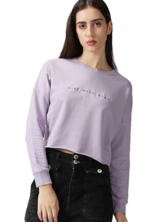 VYBN Women’s Cotton Oversized Crop T-Shirt | Ribbed Cuff Long-Sleeve Solid Short Top | Drop Shoulder Loose Fit Crop Top | Casual, Soft Breathable Fabric | Solid Color and Boho Style (Pastel Lilac_XS)
