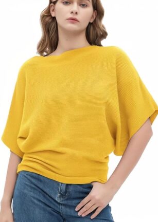 Zilcon Women Fashion Ribbed Batwing Sleeves Bagy Balloon Style Fit Top for Women t Shirts Women Formal, Casual, Office, Date, Outing, Party Tops (in, Alpha, L, Regular, Yellow)