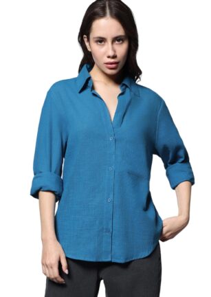 HIGH STAR Women’s Cotton Oversized Fit Shirt (HSWSHW23509_BL_Blue, Small