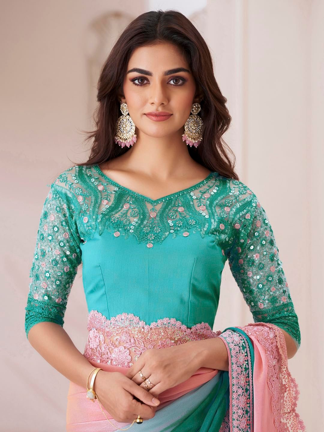 The soothing peach hue enhances its sophisticated charm, while the included unstitched blouse allows for a customized fit, letting you style it your way for any occasion.