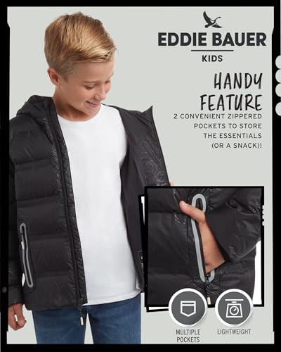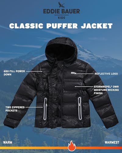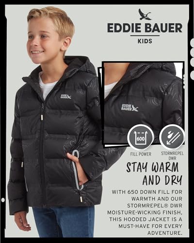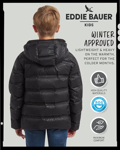 - OFFICIALLY LICENSED EDDIE BAUER: Heavyweight Quilted Down Jacket for Boys and Girls; Eddie Bauer combines its adventure-driven innovation with even more sustainability and inclusivity, using materials and methods that minimize impact, and building an outdoor culture open to everyone