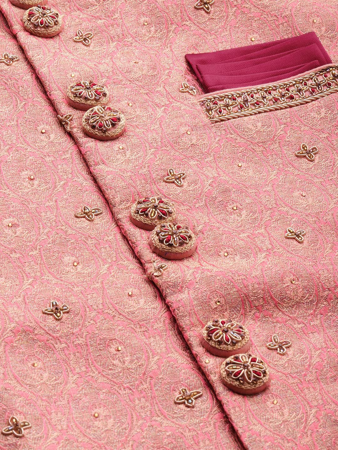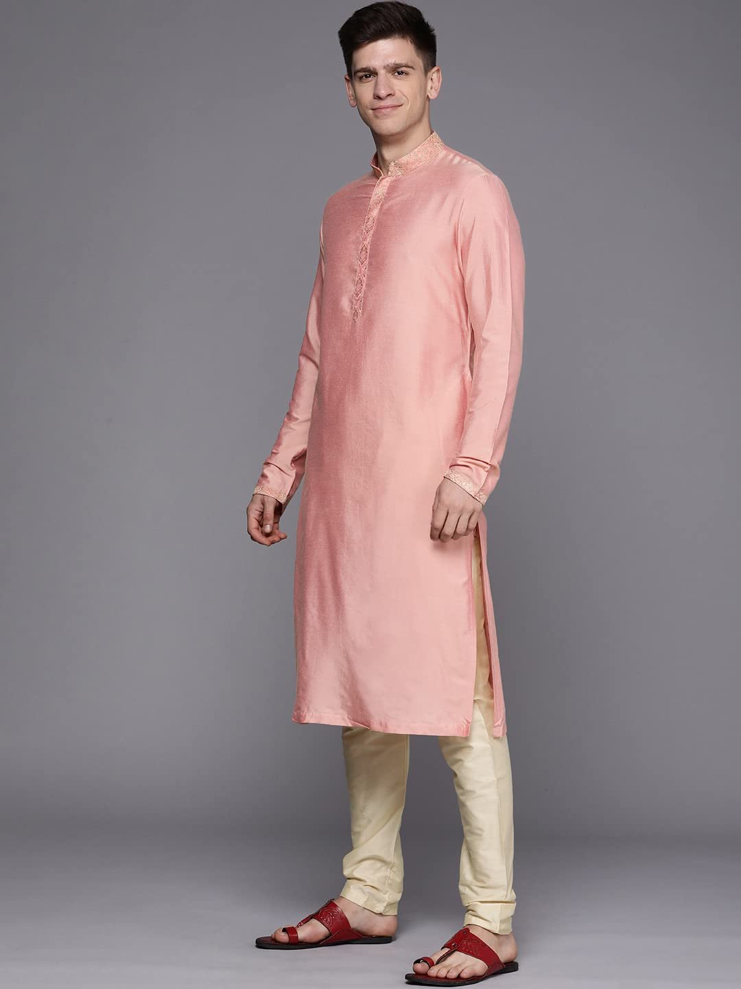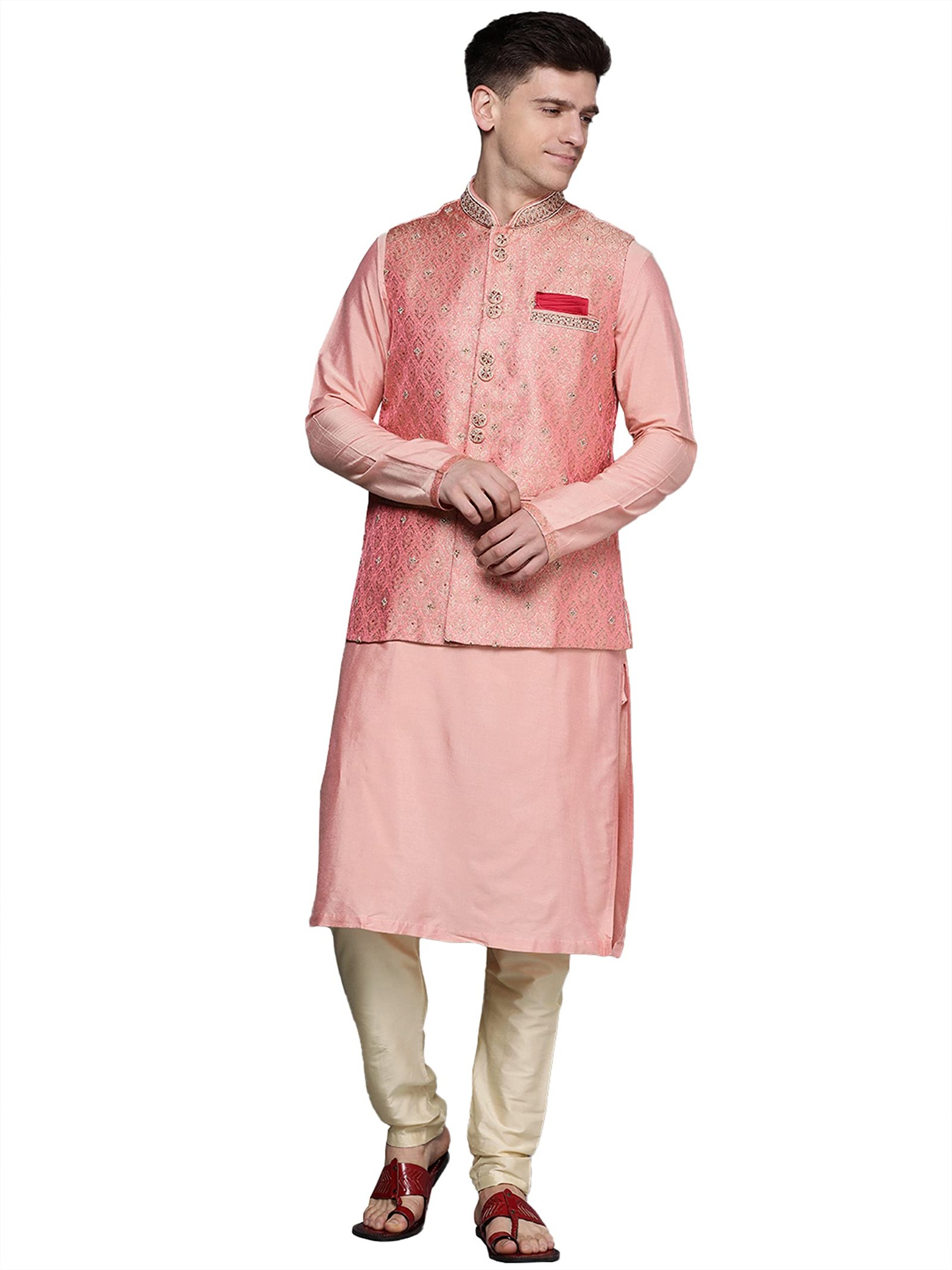 Manyavar is a trusted name in men’s ethnic wear, known for its sophisticated designs and superior quality. This peach kurta jacket set lets you exude charm and confidence at every celebration.