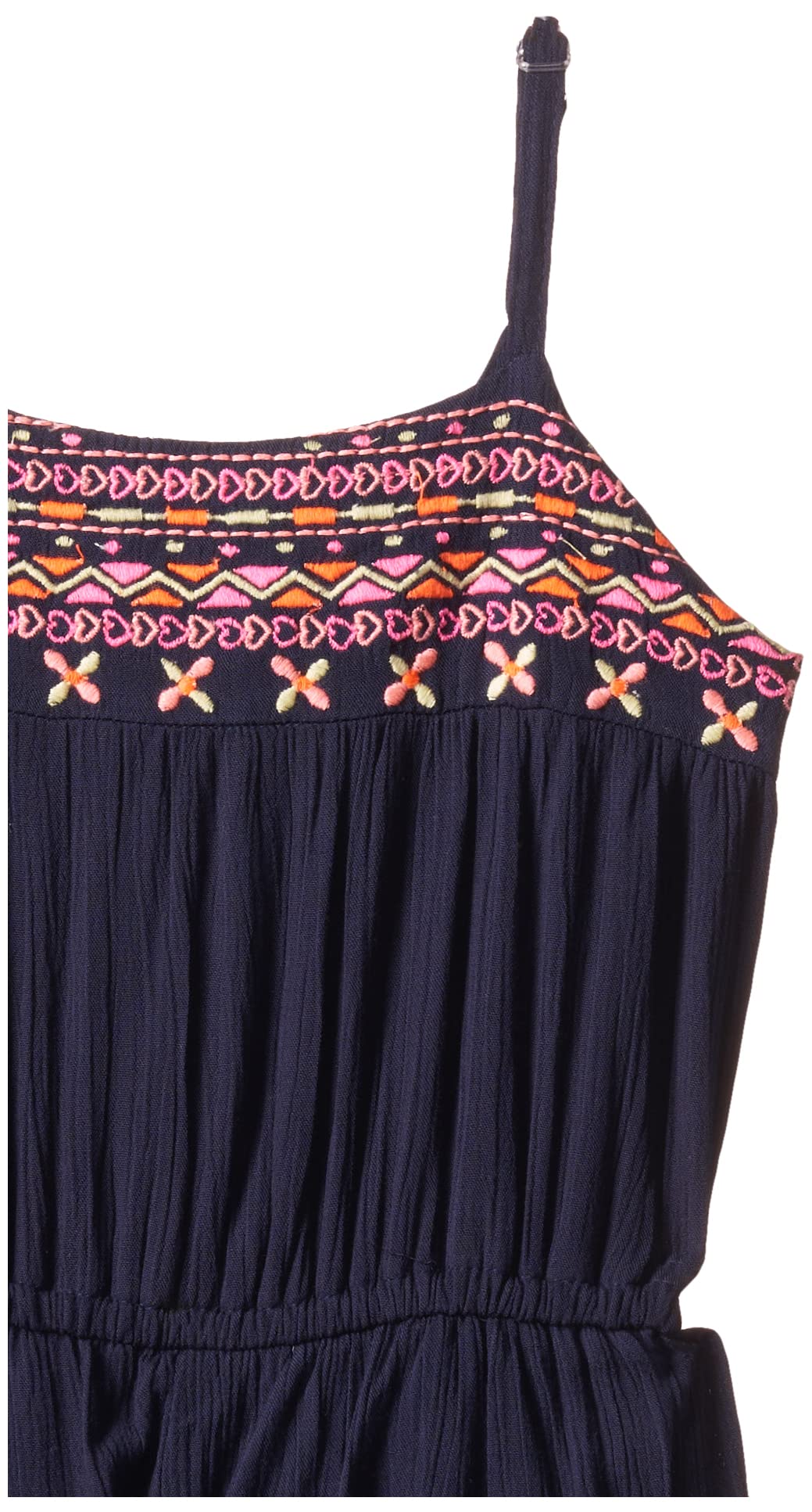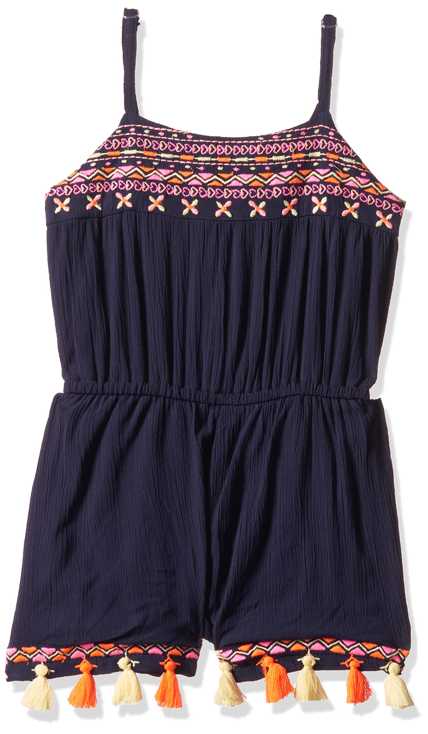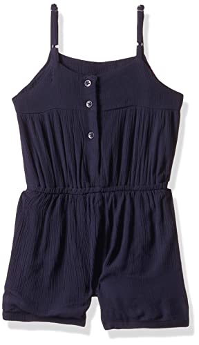 Featuring a solid navy blue color with delicate embroidered detailing, this playsuit combines a classic look with a touch of charm. Its above-the-knee cut ensures ease of movement, making it perfect for active girls.