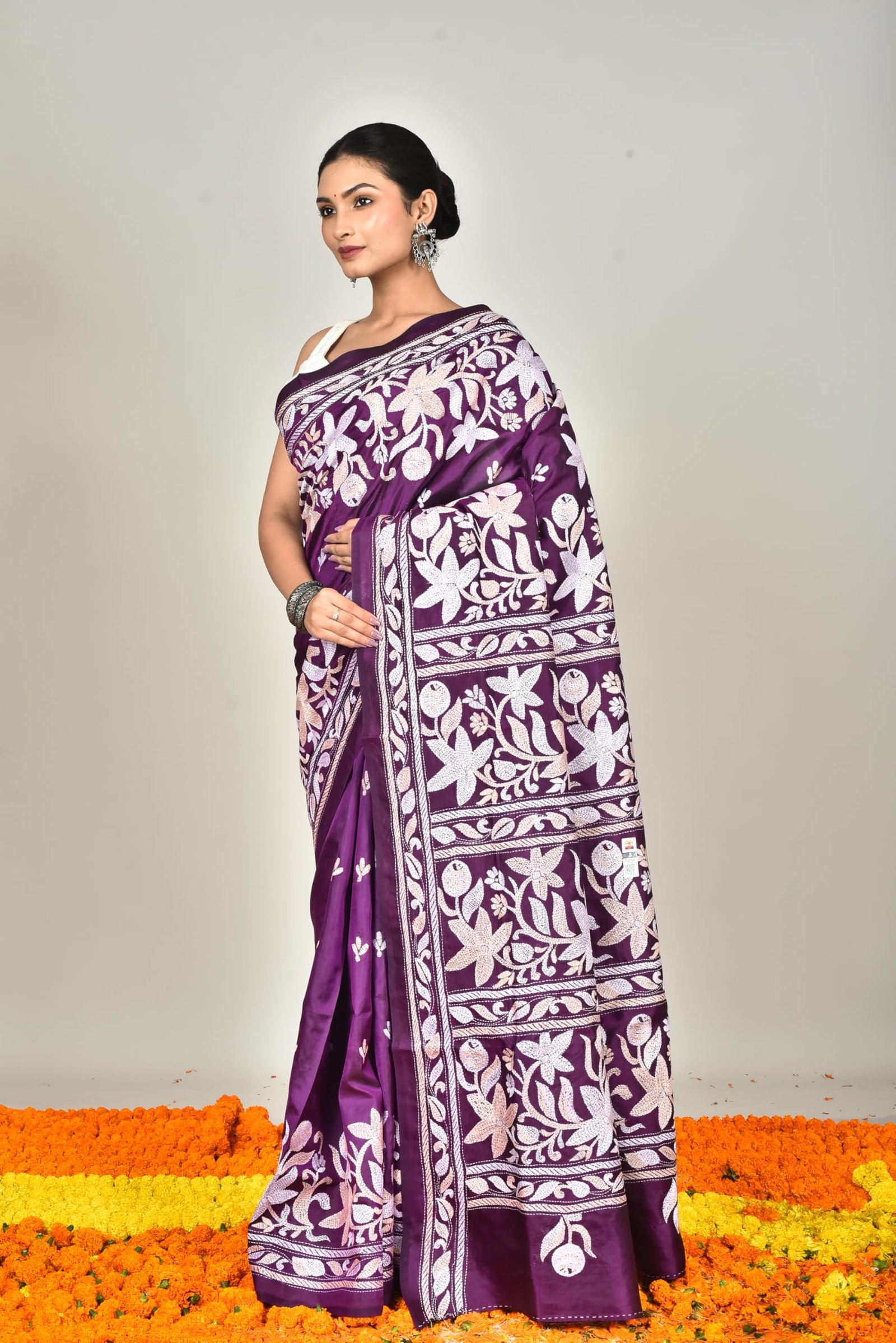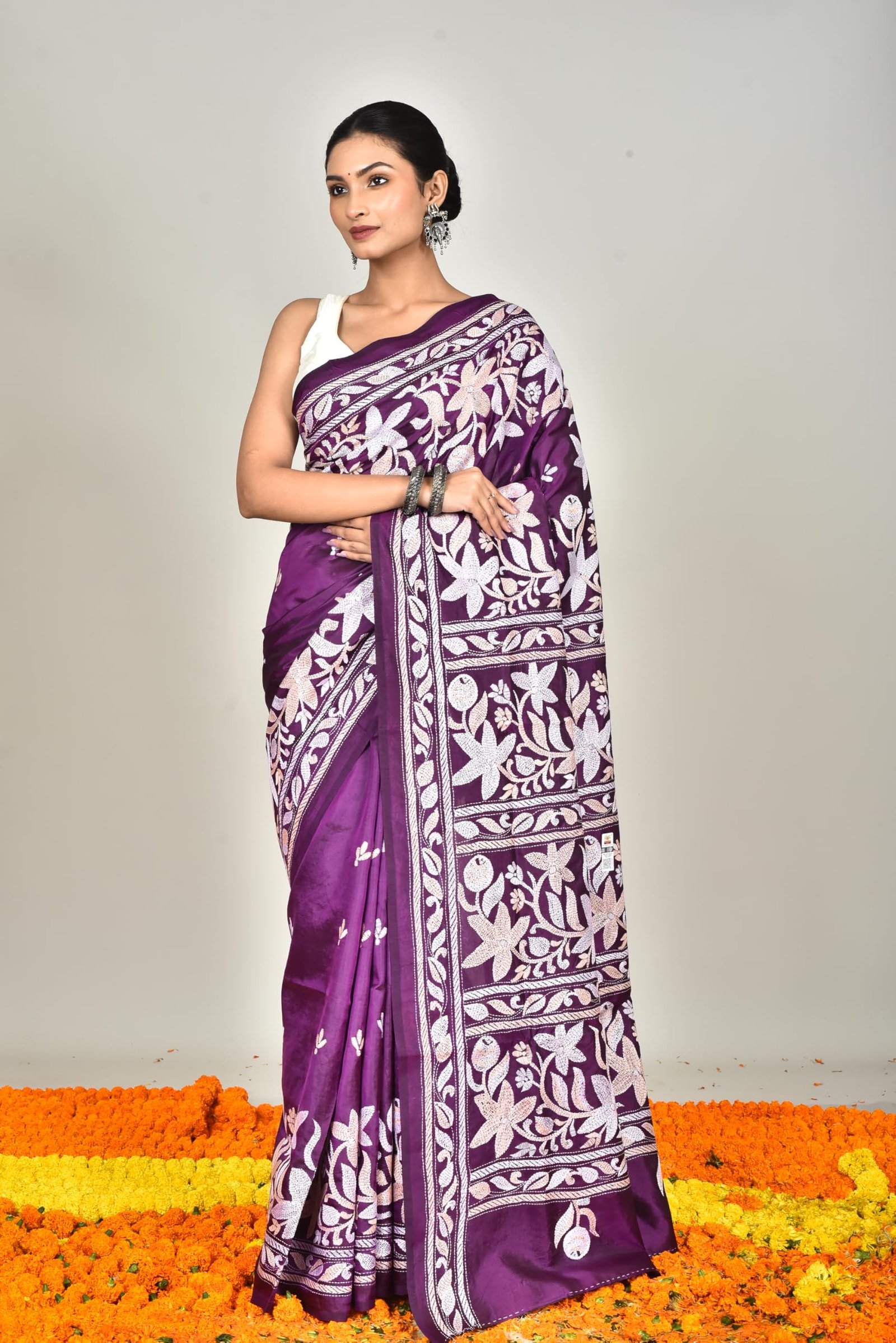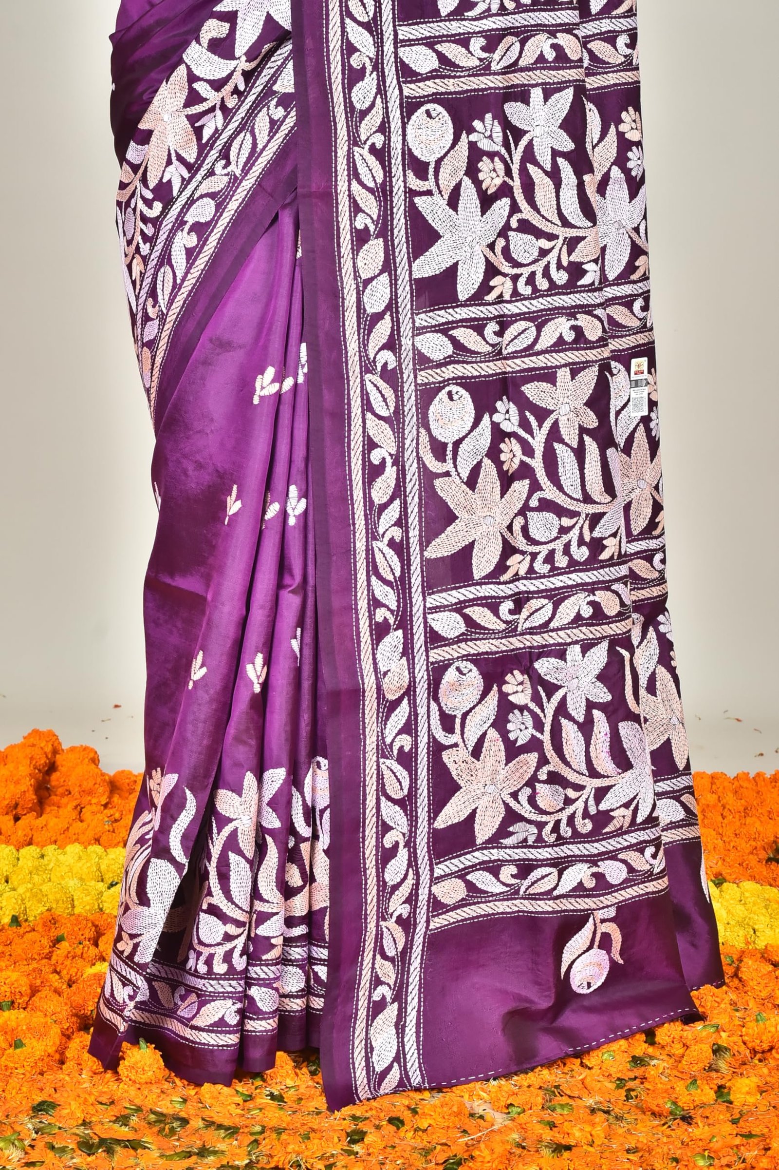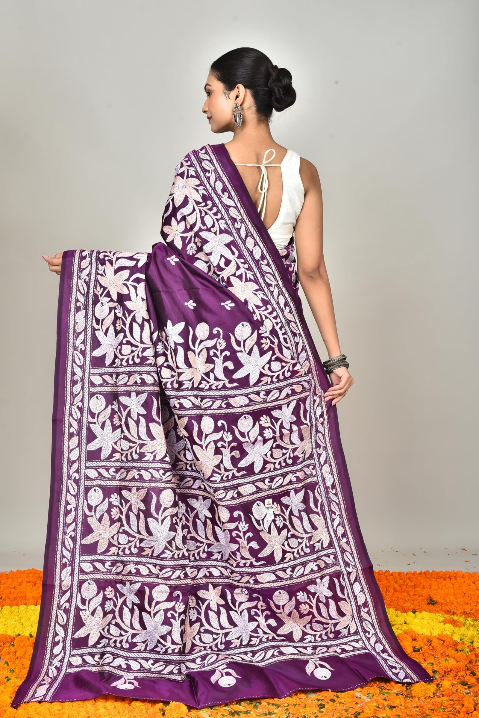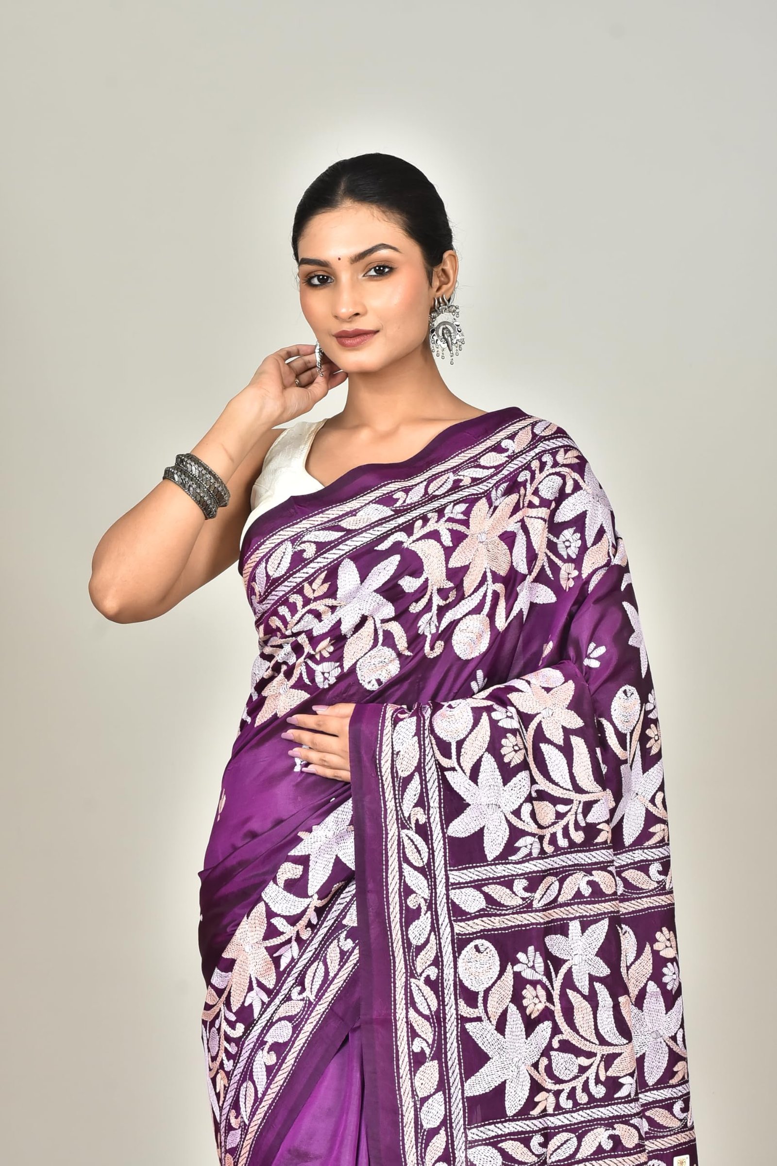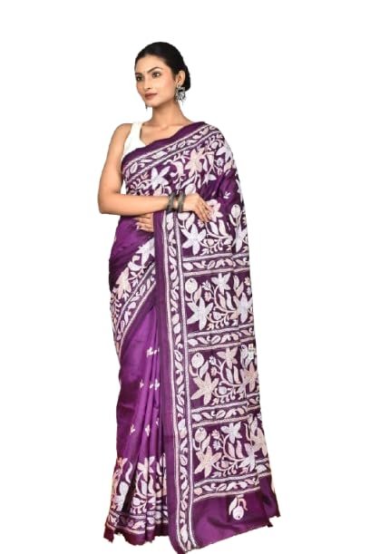 The luxurious silk fabric drapes beautifully, giving you a graceful silhouette that suits both festive and formal occasions. Additionally, the smooth texture keeps you comfortable during long hours of wear. The intricate Kantha stitchwork, done with fine threads, adds a touch of artistry that celebrates India’s rich textile heritage.
