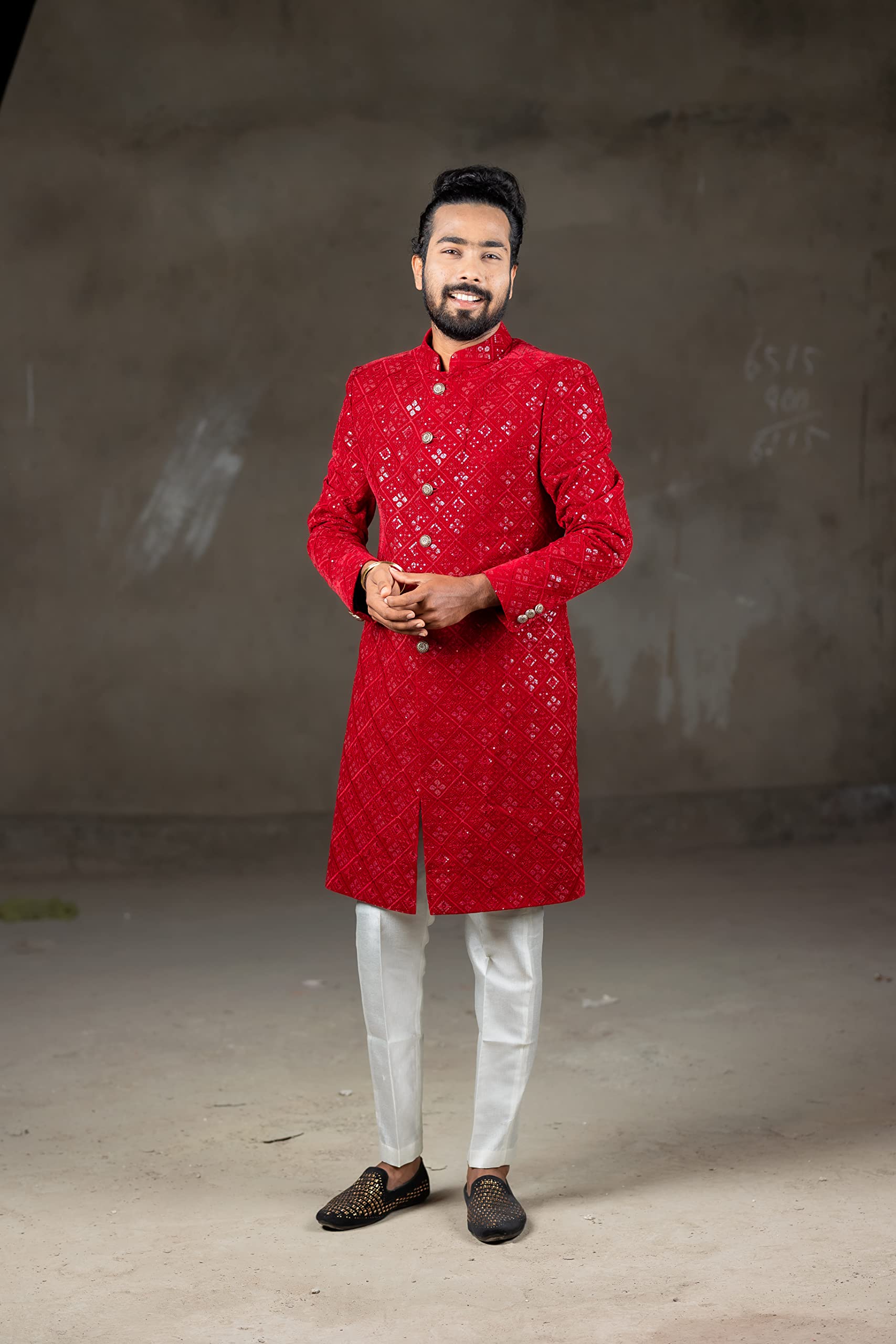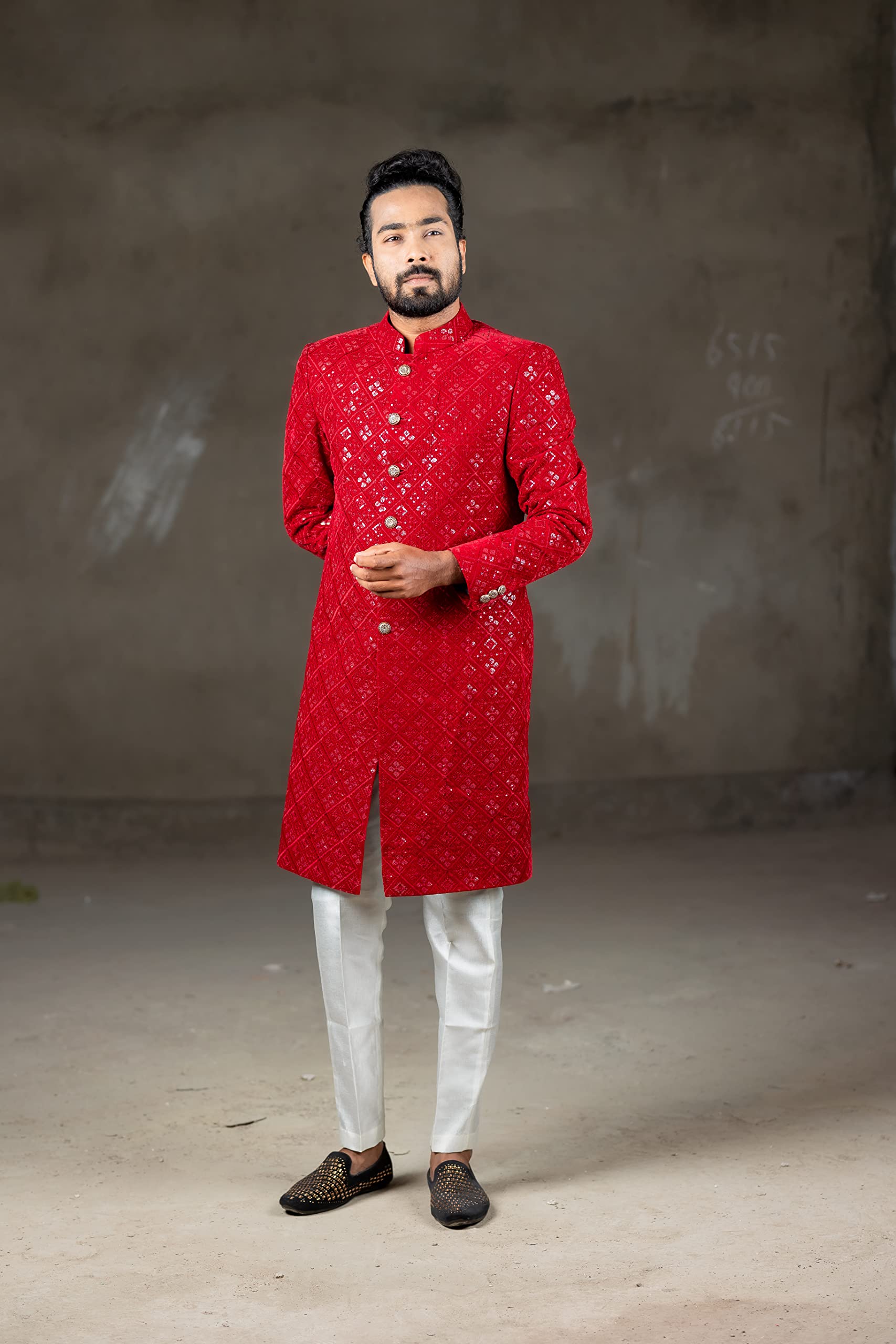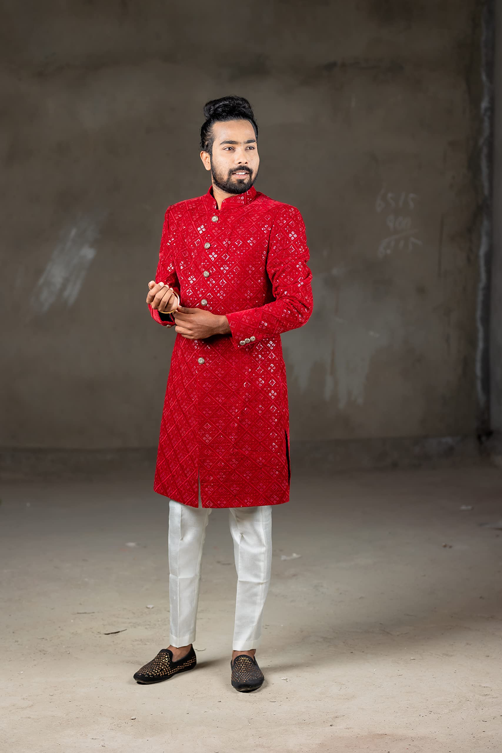 Details: Red & white sherwani Red embroidered sherwani , has a mandarin collar, sliver zari hand red chicken work on sherwani part and sleeves, long sleeves, side slits, straight hem , one side pocket.