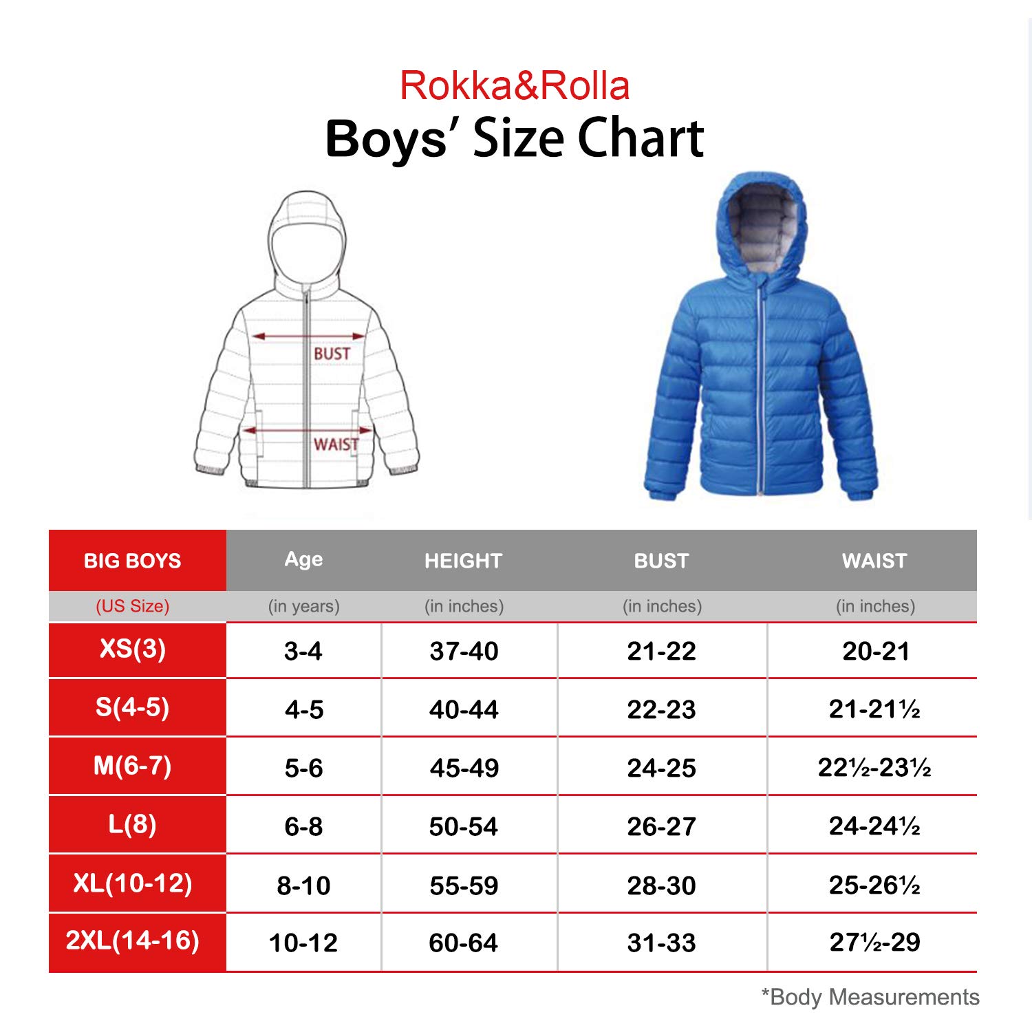 Details: This Rokka&Rolla Boys’ Ultra Lightweight Packable Down Puffer Jacket is insulated by premium duck down with R.D.S down certification for each item. This Rokka&Rolla Boys’ Ultra Lightweight Packable Down Puffer Jacket is designed for warmth and comfort in cold-weather conditions. The windproof shell layer keeps the ultra lightweight down jacket durable enough to withstand the harsh conditions for when you go on outdoor adventures. The Ultra Lightweight Down Jacket has the best Windproof fabric with high-tech workmanship with only 2-layer shell to hold down filler for extremely lightweight. Our high-density, synthetic fiber yarns will help keep the water-resistant puffer down jacket dry in light rain. This winter-ready down jacket has heat thermal insulation to keep your core warm without adding extra weight. Features an interior pocket to keep your belongings safe and a name tag to prevent it from being lost at school. This boys’ puffer down jacket is also ultra lightweight and packable so that you can bring it along with you when you travel to use as a neck pillow. Attention: It is regular fit U.S. size. Please kindly read our size chart with our recommendation for your reference. Care Instructions: Machine washable with cold gentle cycle/Do not bleach/Do not Tumble Dry/Do not dry clean/Wash similar colors together.