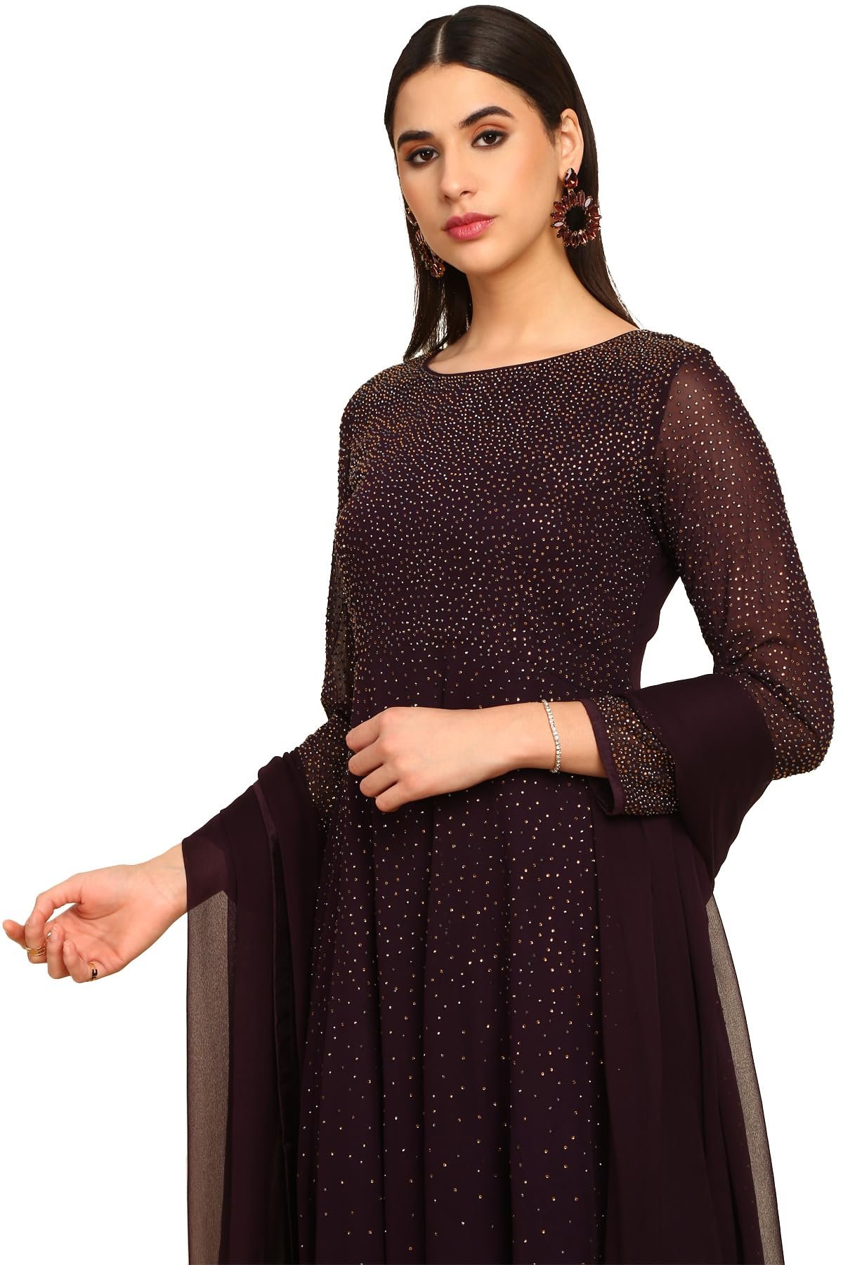 Elevate your festive wardrobe with the Soch Women’s Purple Pure Georgette Embroidered Churidar Set. Crafted from premium pure georgette, this ensemble offers a lightweight, flowy drape that provides both comfort and elegance. Intricate embroidery adds a touch of sophistication, making it perfect for weddings, festive functions, and cultural celebrations.