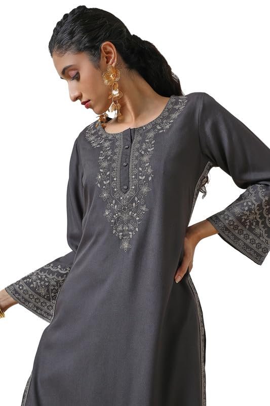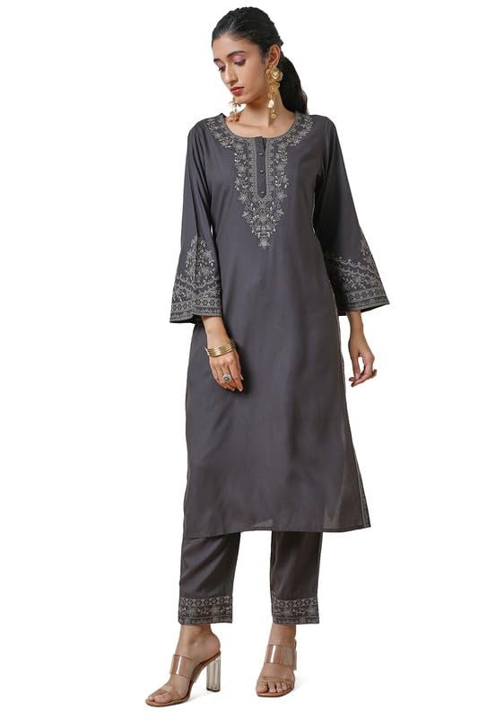 The charcoal base with intricate floral embroidery adds a graceful touch, making it suitable for festive celebrations, office wear, and casual outings. The set includes a beautifully tailored kurta and matching bottoms, ensuring a coordinated, stylish look.