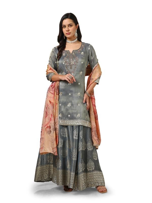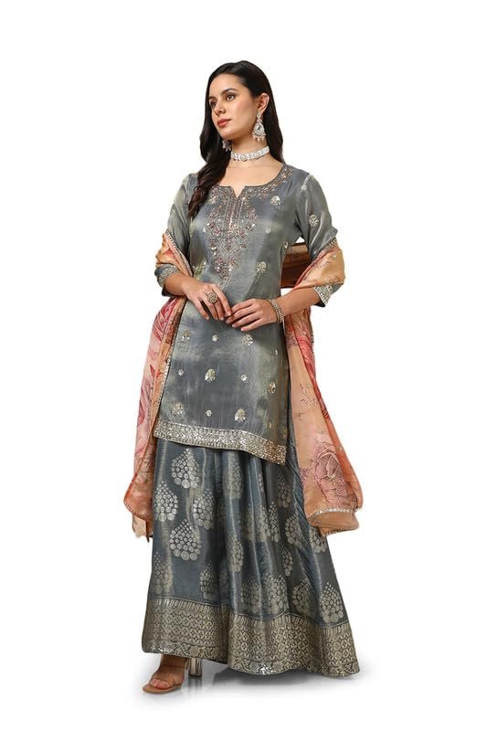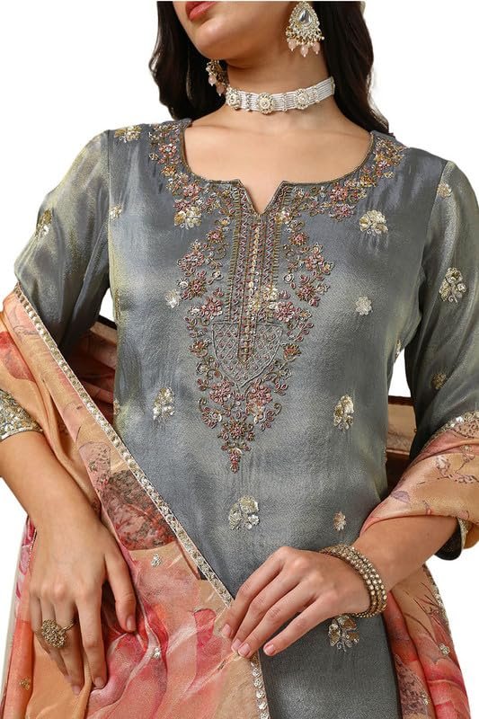 Elevate your ethnic wardrobe with the Soch Women’s Grey Tissue Suit Set, a blend of elegance and contemporary charm. Crafted from premium tissue fabric, this set offers a subtle sheen and a lightweight, airy feel that keeps you comfortable during long celebrations. Delicate sequin embellishments add a touch of sparkle, making it an ideal pick for festive events, evening parties, and wedding functions.