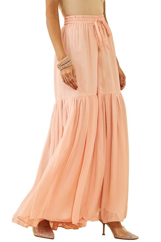 Step into elegance with the Soch Women’s Peach Georgette Embroidered and Sequin Embellished Sharara Suit Set, a perfect blend of tradition and glamour. Crafted from premium georgette fabric, this set offers a lightweight and flowy drape, ensuring all-day comfort.