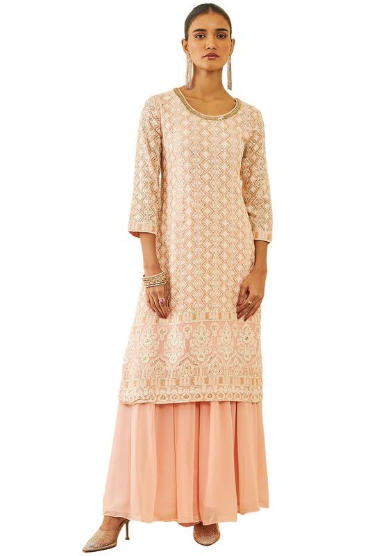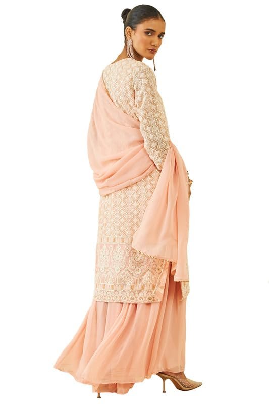 Soch is celebrated for its fusion of traditional artistry and modern elegance. This peach georgette sharara suit set is designed to make you shine at every special occasion, offering comfort, style, and sophistication.