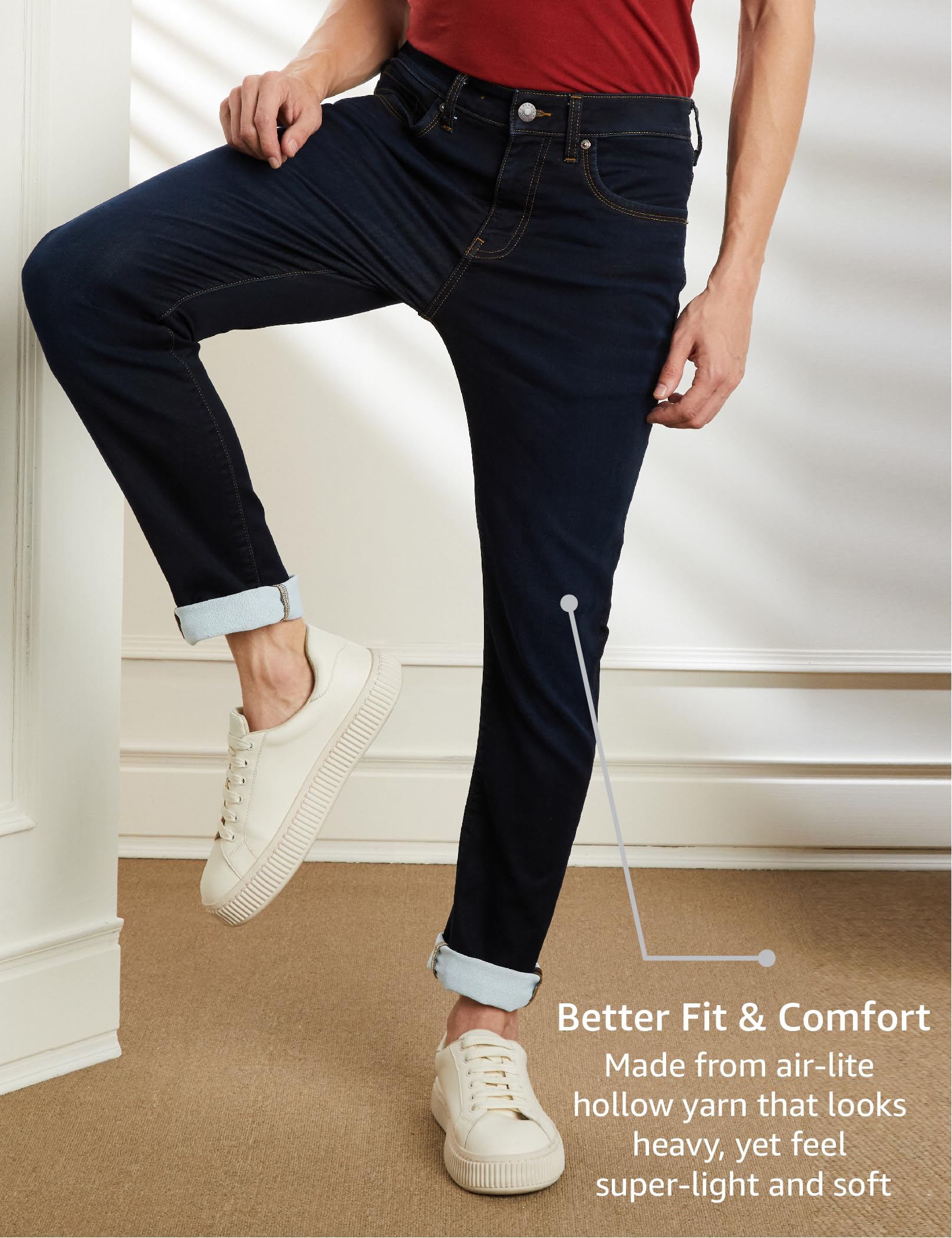 The dark indigo wash brings a versatile appeal that pairs effortlessly with T-shirts, polos, and button-down shirts. Whether for casual Fridays or weekend outings, these jeans keep you looking sharp with minimal effort.