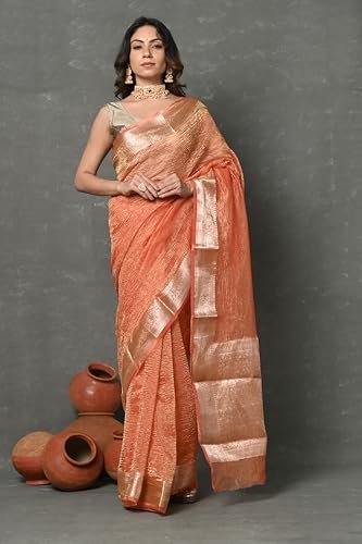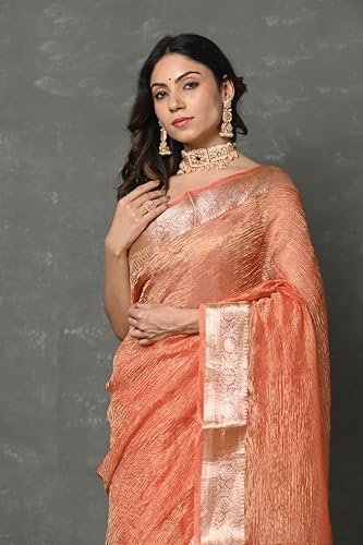 Step into luxury with the Very Much Indian Tyohaar Exclusive Banarasi Handloom Crushed Pure Tissue Silk Saree in a stunning golden-orange hue. Carefully woven by skilled artisans, this saree brings together the rich heritage of Banarasi weaving with the modern appeal of crushed tissue silk. As a result, you get a saree that is as comfortable to wear as it is breathtaking to look at.